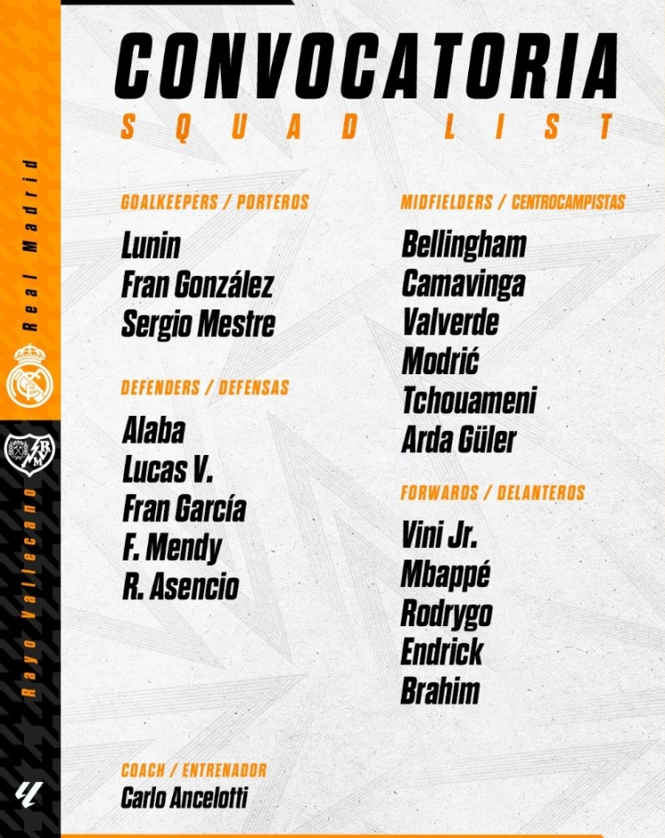 2025-03-09 21:00:51皇馬對(duì)陣巴列卡諾大名單:庫(kù)爾圖瓦缺席,姆巴佩&巴爾韋德在列