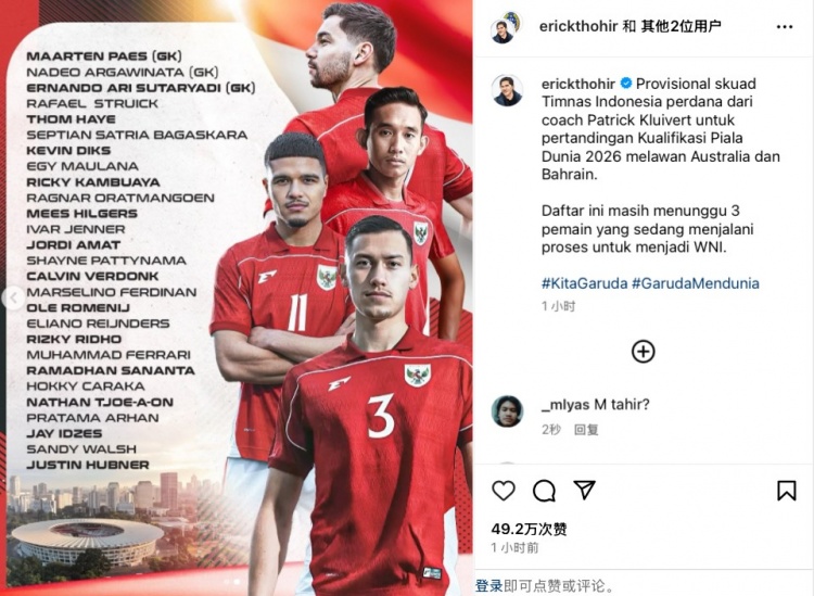 3月9日訊 今日,印尼足協(xié)主席托希爾更新社媒,曬出了印尼國家隊3月份18強(qiáng)賽大名單,迪克斯、伊澤斯、哈耶、帕斯、小賴因德斯、費(fèi)爾東克等歸化球員悉數(shù)入選。