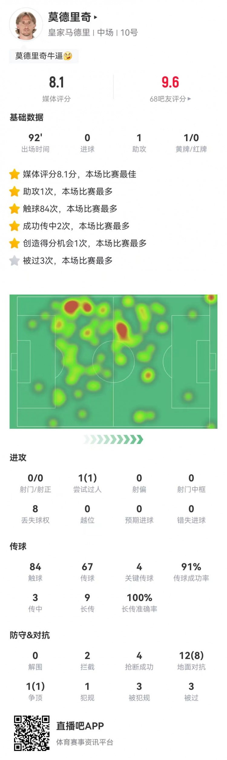 2025-03-10 07:01:18莫德里奇本場1助攻4關(guān)鍵傳球 10長傳9成功 13對抗9成功 8.1分最高