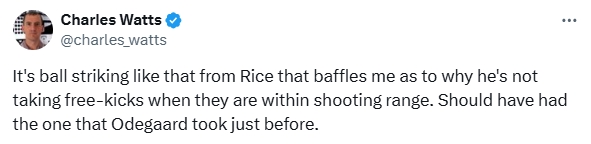2025-03-10 14:00:27記者:為什么任意球不讓賴斯主罰呢?厄德高那球應(yīng)該讓賴斯去踢的