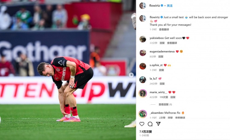 勒沃庫(kù)森官方已經(jīng)宣布維爾茨缺席主場(chǎng)迎戰(zhàn)拜仁的歐冠次回合,并且將缺陣數(shù)周。他本人也通過(guò)社媒曬出自己的比賽照,并表示:“只是一次小考驗(yàn)?????????♂?我將很快以更強(qiáng)的姿態(tài)回歸????????????感謝球迷們發(fā)來(lái)的慰問(wèn)信息。”