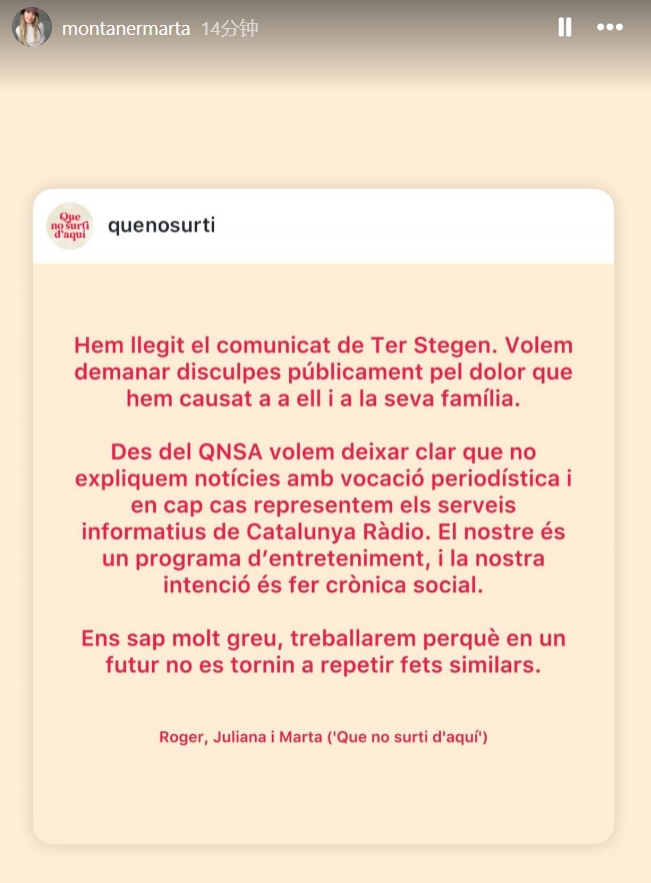 從節(jié)目《Que no surti d’aquí》的角度,我們想明確表示,我們并非以新聞視角報(bào)道事件,也不代表加泰羅尼亞廣播電臺(tái)的新聞服務(wù)。我們的節(jié)目是娛樂(lè)性質(zhì)的,我們的目的是進(jìn)行社會(huì)紀(jì)實(shí)。