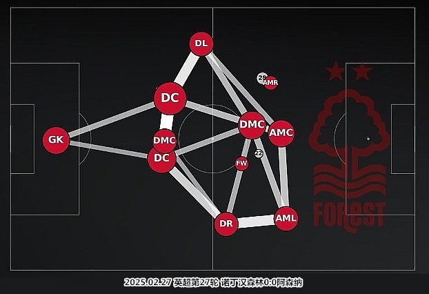 穆里略和米倫科維奇配合默契,埃蘭加和奧多伊可以深度退守保護(hù)邊后衛(wèi),克里斯-伍德總是在不停干擾對(duì)手的傳遞,吉布斯-懷特甚至能夠來(lái)到中衛(wèi)身前扮演清道夫……諾丁漢森林擁有正面防守能力出眾的中衛(wèi)組合,他們身邊聚集了多名柔韌性出眾、腳下纏斗能力強(qiáng)且愿意防守的攻擊手。努諾-桑托的球隊(duì)防守時(shí)頗具拉丁風(fēng)味,依靠錯(cuò)落有致的三線結(jié)構(gòu)堵塞禁區(qū)空間,就是他們的招牌動(dòng)作。
