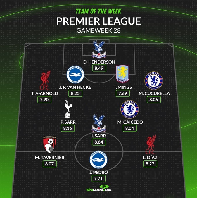 whoscored第28輪英超最佳陣:
