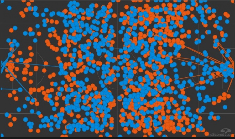 皇馬的比賽節(jié)奏在于邊路的機(jī)會(huì),第一戰(zhàn)他們總共的642次傳球有218次發(fā)生在進(jìn)攻三區(qū),這比馬競要高出不少。其中,左右路傳遞次數(shù)則占據(jù)了他們?cè)谶M(jìn)攻三區(qū)的大部分選擇,再加上他們本賽季其他比賽的數(shù)據(jù)分析可確定,這就是皇馬的比賽風(fēng)格。