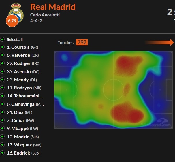 可以想到,因?yàn)樵谌鄙俅笾袖h的情況下,他們不可能按照過去有中鋒時(shí)(哪怕是何塞-盧)那樣的傳中、搶點(diǎn)、后排套上爭搶機(jī)會(huì)模式來打了。維尼修斯、羅德里戈、包括姆巴佩都是在突擊方面遠(yuǎn)勝過被迫的站樁方面效率選手,因此,他們也會(huì)自主扯到邊路來踢球。