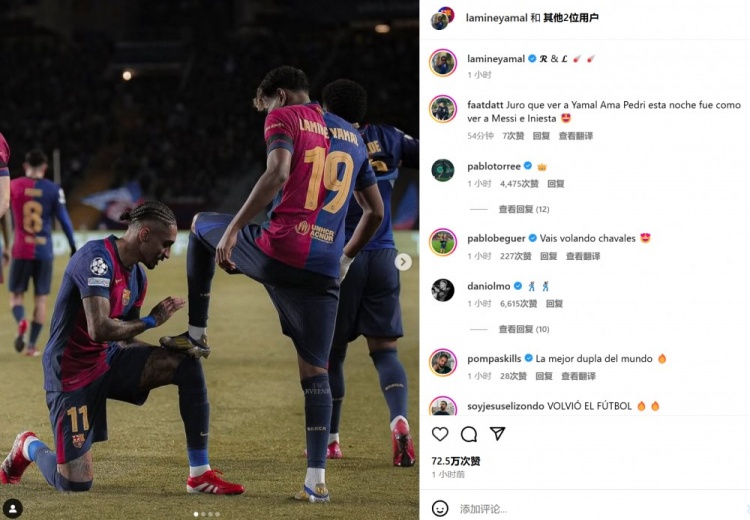 2025-03-12 14:02:24起飛!巴薩兩大邊鋒社媒互動,同時曬出拉菲尼亞為亞馬爾擦鞋照