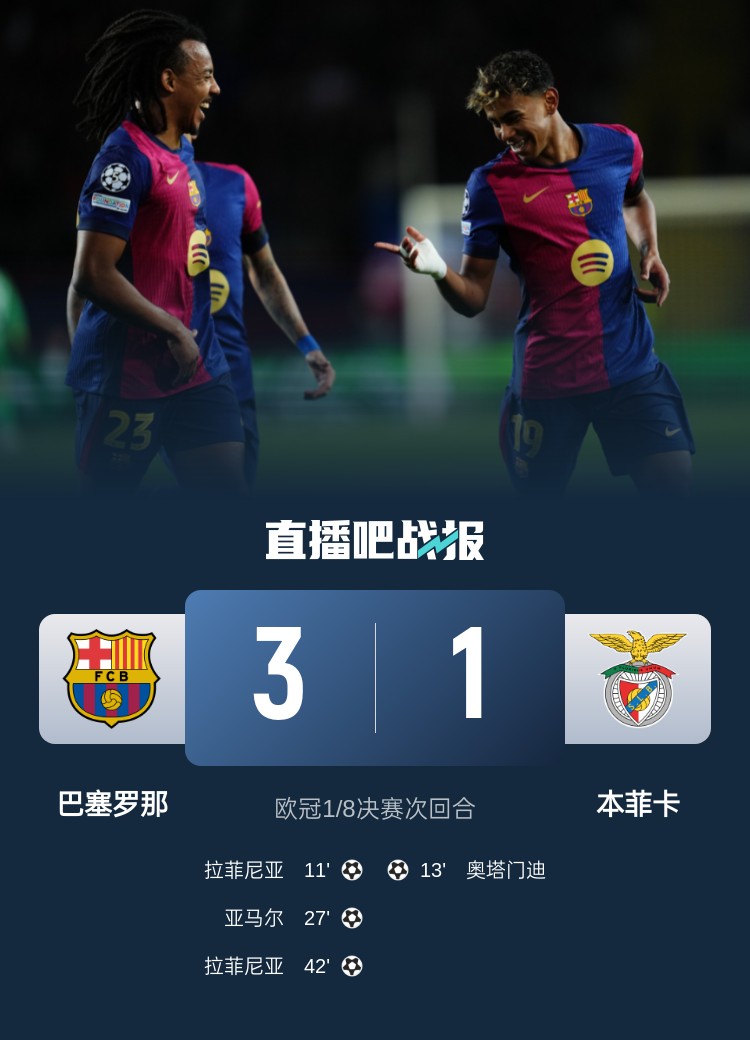 拉菲尼亞2射1傳,巴薩3-1擊敗本菲卡,總比分4-1淘汰對(duì)手!率先進(jìn)入歐冠8強(qiáng)。