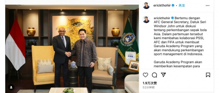 托希爾在社媒配文寫道:“今日會見了亞足聯(lián)秘書長拿督溫莎-約翰,會上我們共同就亞洲足球未來的發(fā)展方向進行探討,此外還討論了印尼足協(xié)與亞足聯(lián)、國際足聯(lián)合作開辦的雄鷹足球?qū)W院項目,以進一步促進印尼足球的發(fā)展?!?/p>