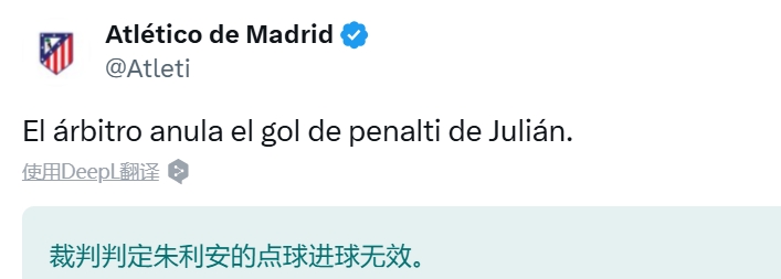 在巴爾韋德進(jìn)行第三罰之前,裁判介入隨后馬競(jìng)官推表示裁判判定阿爾瓦雷斯的點(diǎn)球無效。