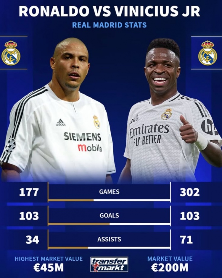 2025-03-13 07:01:14已是傳奇!大羅皇馬生涯177場103球34助,維尼修斯302場103球71助