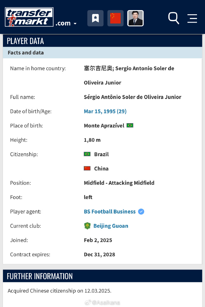 03月13日訊 德國(guó)轉(zhuǎn)會(huì)市場(chǎng)管理員朱藝發(fā)文,表示塞爾吉尼奧已經(jīng)完成了中國(guó)入籍手續(xù),轉(zhuǎn)會(huì)市場(chǎng)網(wǎng)已經(jīng)根據(jù)相關(guān)情況將中國(guó)國(guó)旗添加到了他的資料中。