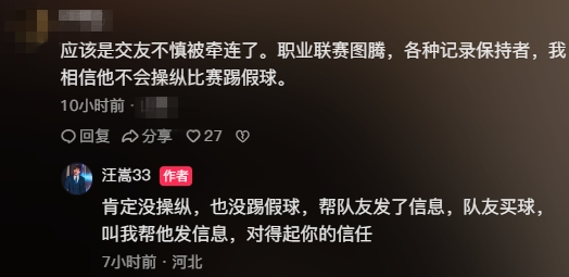 2025-03-13 14:00:57汪嵩再回評論:肯定沒操縱也沒踢假球,隊友買球叫我?guī)退l(fā)信息