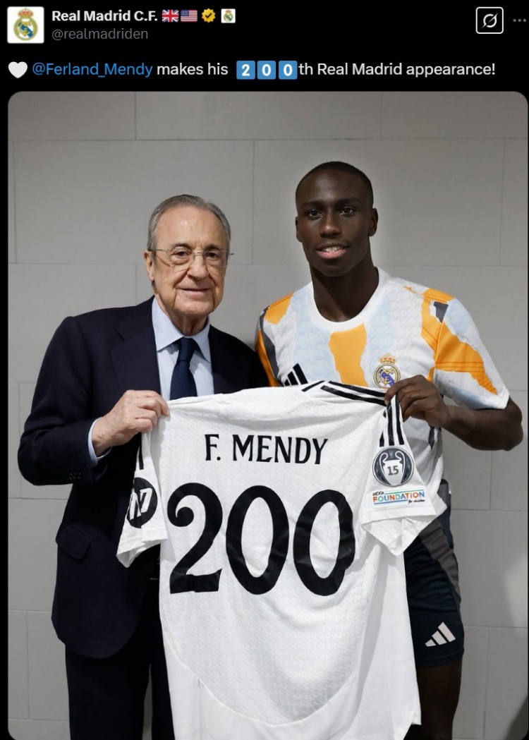 2025-03-13 14:01:42門迪達(dá)成皇馬200次出場(chǎng)里程碑,獲贈(zèng)紀(jì)念球衣&與弗洛倫蒂諾合影