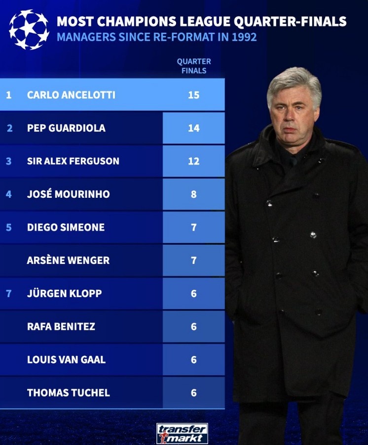 2025-03-13 14:02:06歐冠改制后主帥晉級(jí)8強(qiáng)次數(shù)榜:安切洛蒂15次居首,瓜帥次席