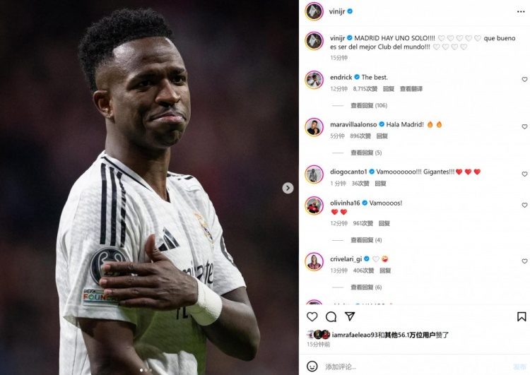 2025-03-13 14:02:16維尼修斯社媒發(fā)文:馬德里只有唯一,作為世界最佳球隊一員太棒了