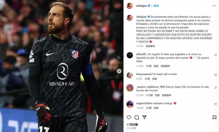 3月13日訊 馬競(jìng)在本輪歐冠主場(chǎng)被皇馬點(diǎn)球淘汰,門將奧布拉克在不久前通過(guò)社媒發(fā)文。