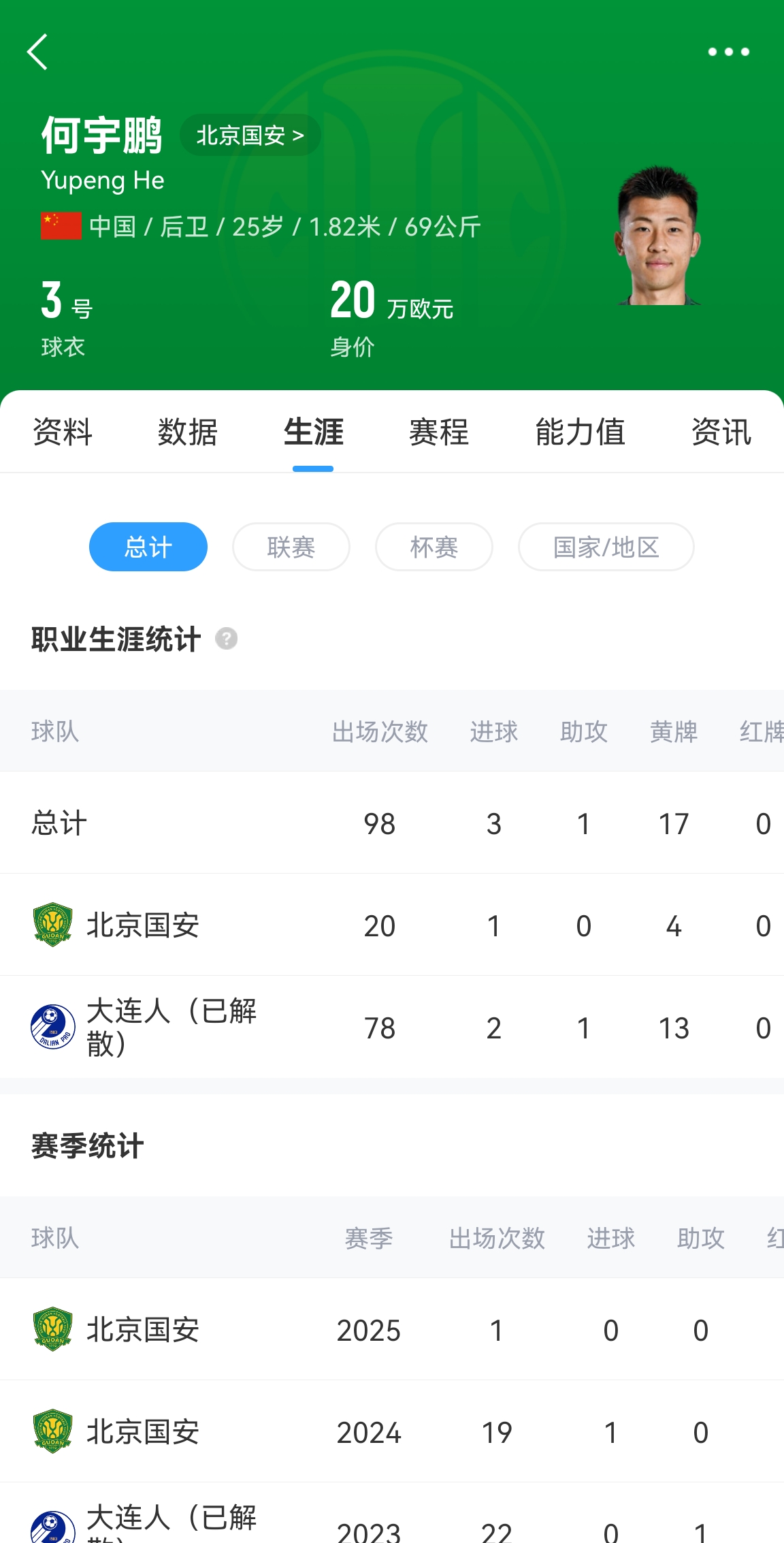 何宇鵬現年25歲,2024年加盟北京國安,本賽季前2輪中超為國安出戰(zhàn)1次。